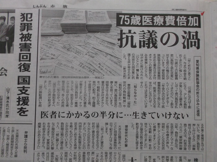 憲法便り 4782 75歳以上の医療費窓口負担2倍化法案に 抗議の渦 愛知県保険医協会の折り込みに 約2週間で返信が2136通 4155人分の署名が集まる 医者にかかるのを半分に 生きていけない 岩田行雄の憲法便り 日刊憲法新聞